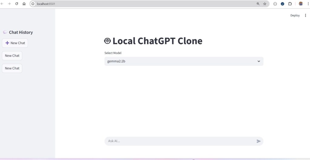 From the attached screenshot, you can see its elegant and minimalistic interface, featuring a chat history panel, new chat creation buttons, and an AI response area — similar to ChatGPT’s layout but running locally on localhost:8501.